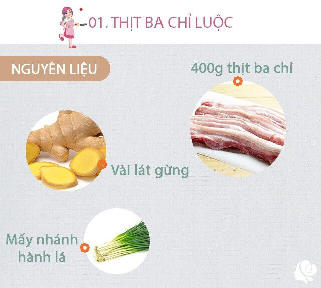 Chuẩn bị: 400g thịt ba chỉ rửa sạch, vài lát gừng, một ít hành lá.