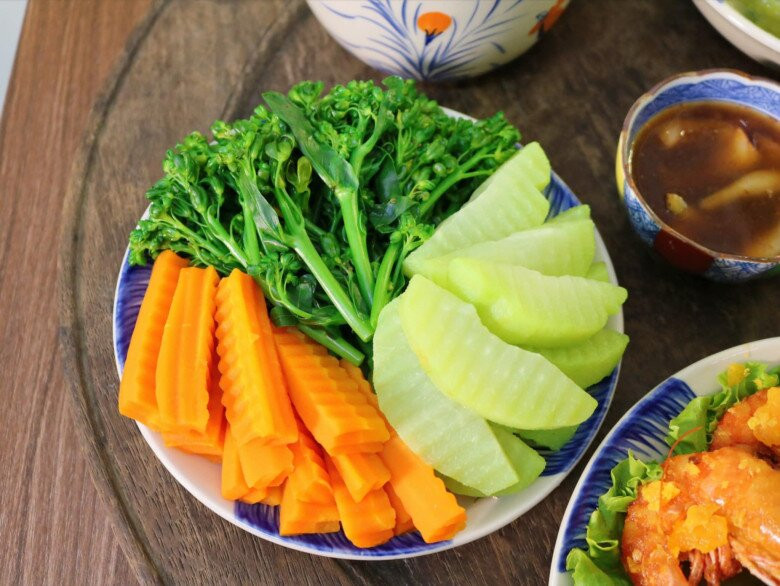 Chuẩn bị: 300g súp lơ baby, 2 quả su su, 1 củ cà rốt, muối.