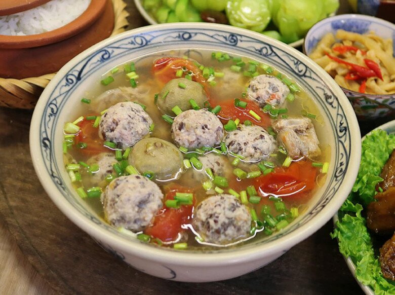 Thịt băm trộn với mộc nhĩ và nấm hương đã ngâm mềm băm nhỏ. Thêm chút muối, viên tròn lại các viê bằng nhau. Phi thơm hành khô trong nồi cùng sấu đã cạo vỏ, cho cà chua thái múi cau vào, đảo cho thơm rồi thêm nước vừa đủ. Đun sôi, nêm muối vừa ăn, thả các viên thịt vào, nấu sôi lửa vừa khoảng 7-8 phút là chín. Dầm sấu ra cho canh chua, rắc hành lá, mùi tàu thái nhỏ là xong.