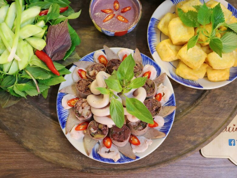 Chuẩn bị: 200g lòng non luộc; 200g dồi lợn; 100g gan lợn luộc; dạ dày và tràng, khấu đuôi... mỗi thứ một ít, 1 nắm hành lá