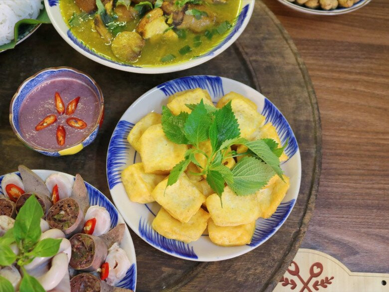 Đun nóng dầu ăn trong chảo, cho các miếng đậu đã cắt miếng vừa ăn vào rán cho đến khi chín vàng thì vớt ra đĩa. Khi thưởng thức, chấm đậu phụ rán với mắm tôm và rau kinh giới sẽ rất ngon