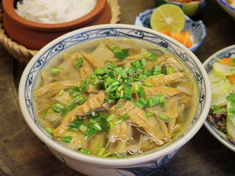 Hành khô phi thơm, cho măng khô đã được sơ chế và làm sạch vào xào. Nêm thêm gia vị cho đậm đà rồi cho xương và nước luộc gà vào. Nấu cho măng mềm, nêm nếm lại cho vừa miệng. Rắc hành lá thái nhỏ là xong.