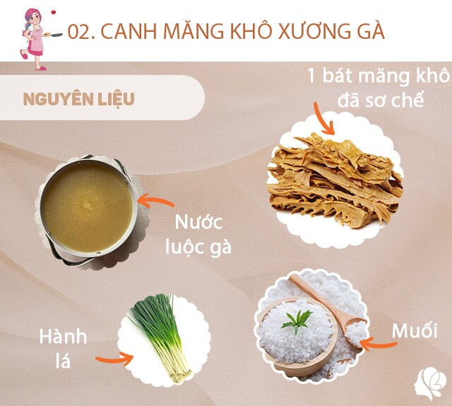 Chuẩn bị: Nước luộc gà, xương gà (cổ, đầu), 1 bát măng khô to đã ngâm và làm sạch, hành lá, hành khô.