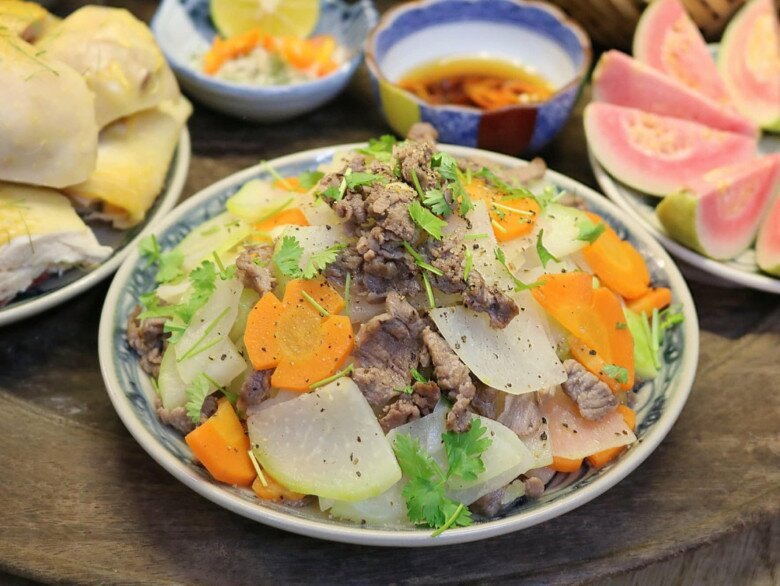 Chuẩn bị: 200g thịt bò, 1 củ su hào, gừng, tỏi, rau mùi, hạt tiêu, 1/3 củ cà rốt tỉa hoa