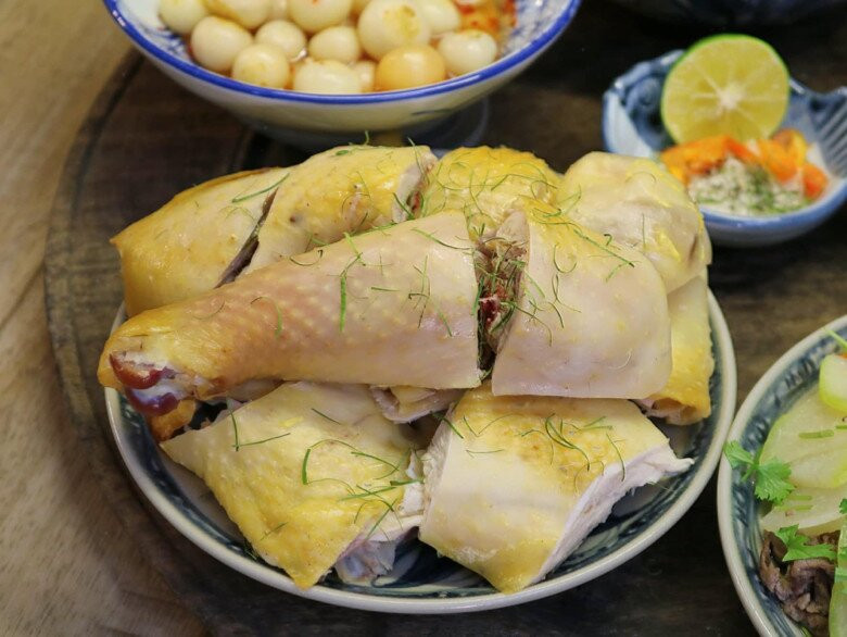 Cho gà đã rửa sạch vào nồi, thêm nước lạnh, đập dập 1 củ gừng vào, luộc cho đến khi gà chín thì vớt ra. Để nguội, chặt miếng vừa ăn, thái lá chanh rắc lên.