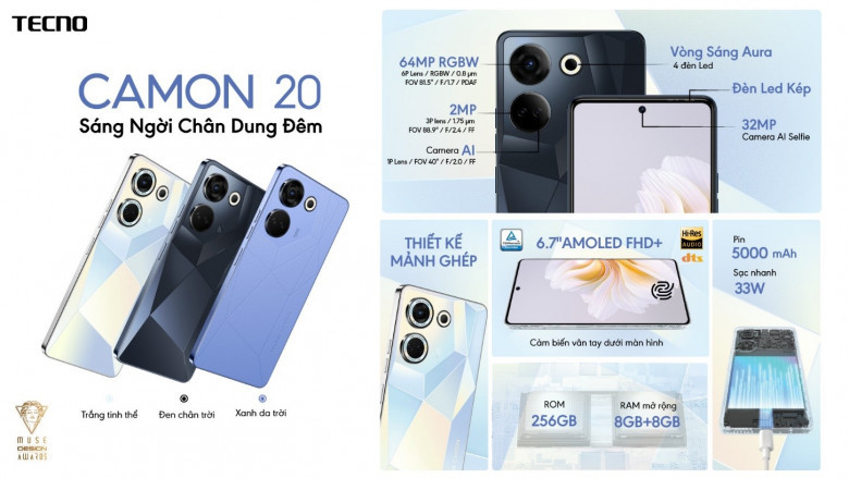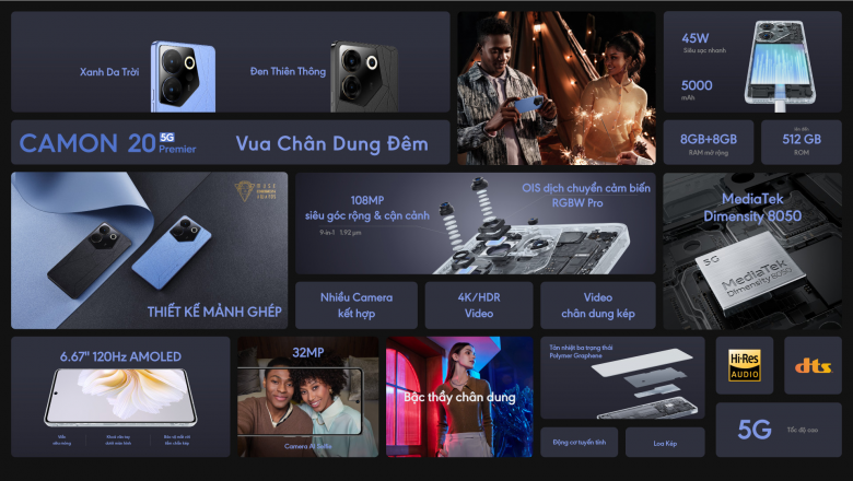 CAMON 20 Premier 5G là thiết bị hàng đầu trong dòng CAMON 20. Máy có màn hình AMOLED 6,7 inch FHD+, bộ nhớ trong 512 GB, RAM 8 GB và pin 5000 mAh. Thiết bị này cũng có OIS dịch chuyển cảm biến, camera phía sau 108 MP với góc chụp siêu rộng và chụp siêu cận cảnh cùng ống kính chân dung 2 MP. Máy có camera trước 32MP với đèn flash kép và chạy trên Android™ 13. Bộ xử lý Dimensity 8050 mạnh mẽ cũng được trang bị trên dòng máy này. Và CAMON 20 Premier 5G sẽ được mở bán từ ngày 23-25/6.