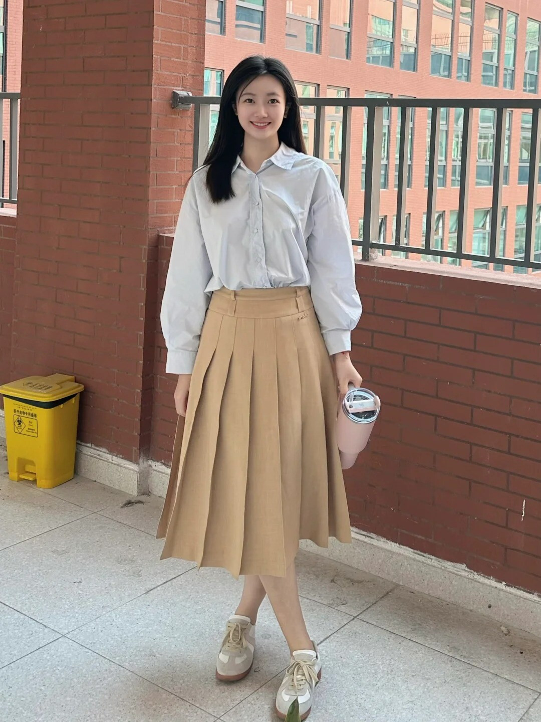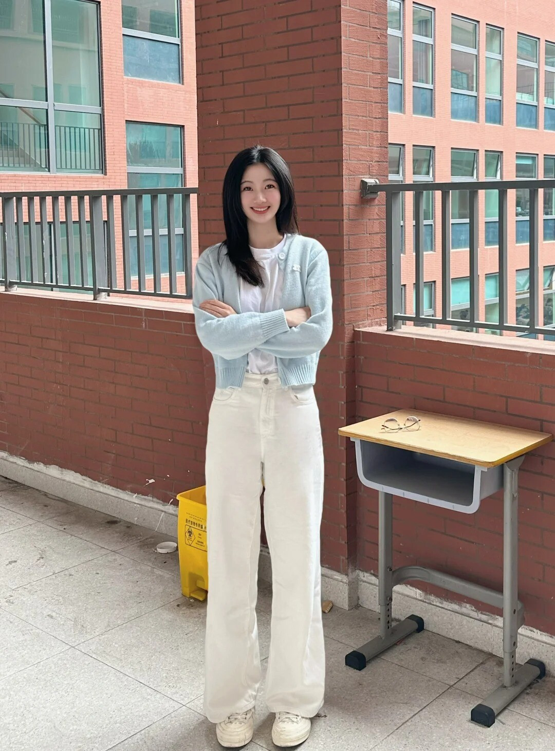 Cô nàng cũng không quên kết hợp thêm những chiếc áo cardigan nhẹ nhàng để che đi phần bắp tay lộ ra ngoài.