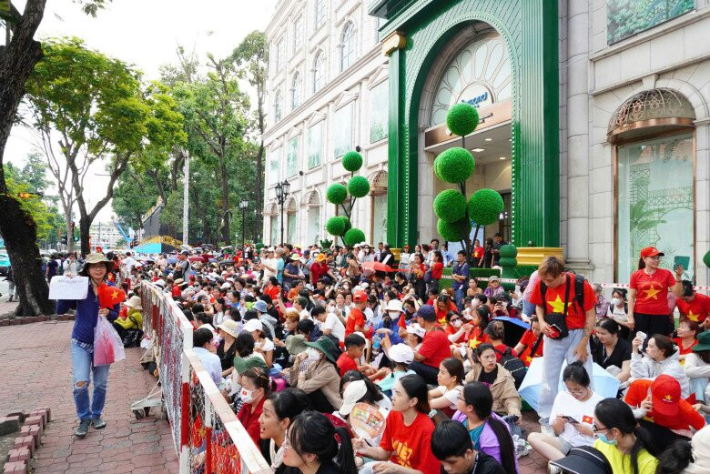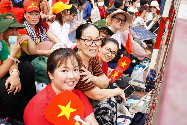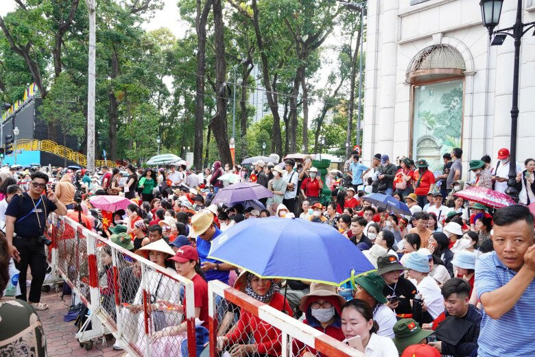 Ngay từ 12h trưa, gia đình chị đã có mặt tại đường Lê Duẩn (quận 1), bất chấp thời tiết TP.HCM oi bức và nắng như đổ lửa. Để chuẩn bị cho một ngày dài, chị Hân đã mang theo đầy đủ nước uống, dù che nắng và những chiếc quạt cầm tay. Cả gia đình, từ người lớn đến trẻ nhỏ, đều háo hức chờ đợi khoảnh khắc các đoàn diễu binh bắt đầu tiến qua.