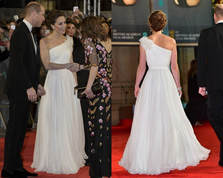 Năm đó, Kate Middleton như nữ thần trên thảm đỏ danh giá. Cô lấn át toàn bộ dàn celebs khác với diện mạo tiên tử trong thiết kế lệch vai màu trắng xếp ly bồng bềnh này.