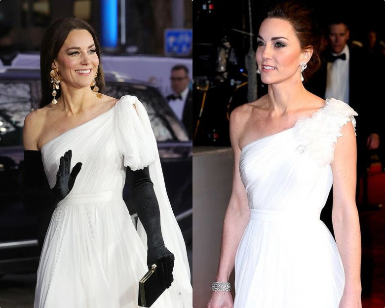 Thực tế Vương phi xứ Wales đã mặc lại chiếc váy trắng trễ vai của Alexander McQueen mà cô đã từng diện vào năm 2019 cũng của Lễ trao giải BAFTA.