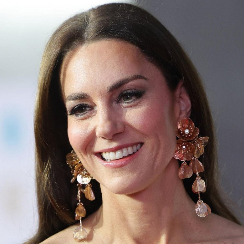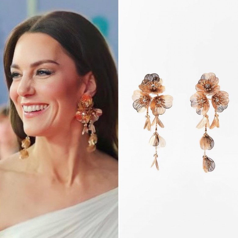 Kate tô điểm cho vẻ ngoài của mình bằng đôi bông tai vàng hồng thanh lịch với chi tiết hoa. Chúng đến từ nhà bán lẻ Zara bình dân và có đính kim cương giả. Nó chỉ có giá rơi vào khoảng 18 bảng Anh.