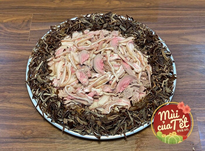 Thái mỏng tai, lưỡi và thịt chân giò. Sau đó, ướp với nước mắm, hạt tiêu, và một chút muối trong khoảng 30 phút để nguyên liệu ngấm đều gia vị. Đồng thời, nấm hương và mộc nhĩ ngâm nước ấm cho nở, rửa sạch rồi thái sợi nhỏ.