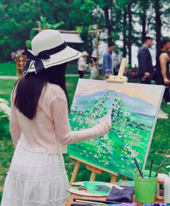 Giữa tháng 3, cô nhận lời mời tham gia một đám cưới ở Ninh Ba. 9 giờ sáng, Xiao Feng đã có mặt tại địa điểm, chuẩn bị canvas và màu vẽ, sớm hơn 3 tiếng so với giờ làm lễ.