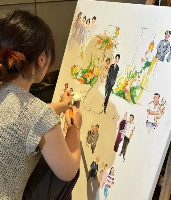 Ở một góc nhỏ của khán phòng, một cô gái trẻ đang miệt mài bên khung vẽ, ghi lại khoảnh khắc hạnh phúc ấy. Nghề họa sĩ vẽ tranh trực tiếp tại tiệc cưới nghe có vẻ mới lạ, nhưng đang âm thầm phát triển mạnh mẽ trong những năm gần đây.