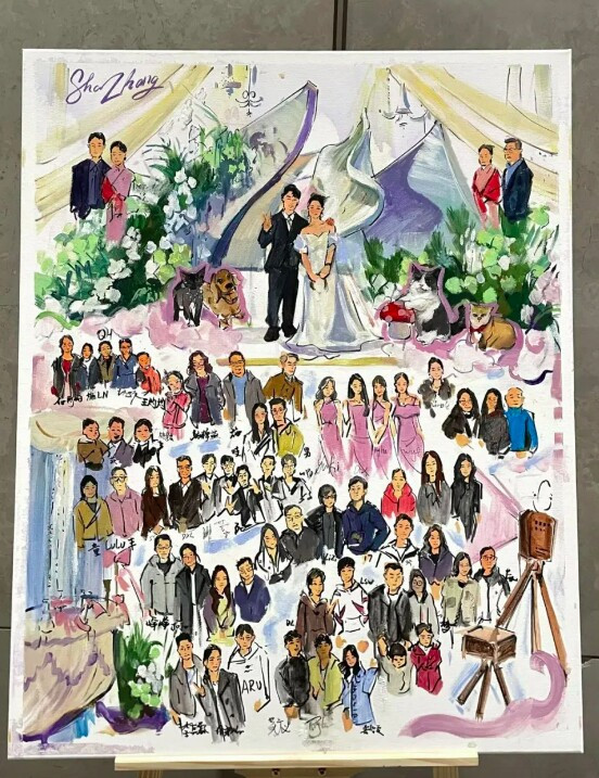 Tại đám cưới, Xiao Feng tỉ mỉ quan sát và vẽ lại biểu cảm của hơn 60 người thân và bạn bè của cặp đôi, đồng thời mời mọi người ký tên lên bức tranh.