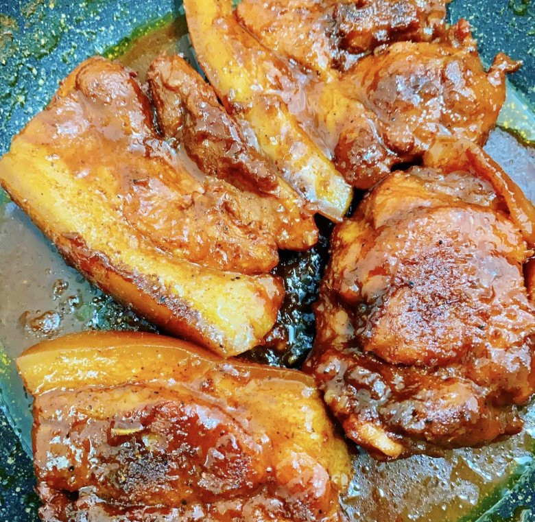 - Sau đó cho thịt cùng nước sốt vào chảo đun sôi + 50ml nước sôi. Đậy vung lại đun mức lửa nhỏ nhất đến lúc nước sốt sền sệt, lên màu đẹp là được.