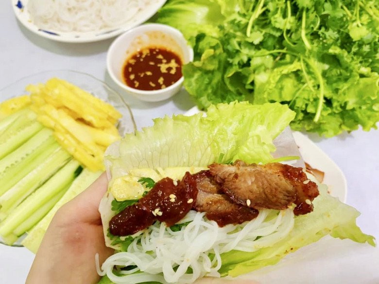 Ngoài ăn với cơm, xôi, bánh mì, bạn có thể đem cuốn với bún và rau thơm cũng rất hấp dẫn.
