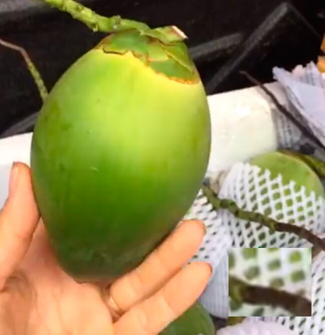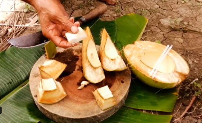 Quả dừa này không cần phải chặt ra lấy nước, mà chỉ cần khoét nhẹ ở trên đầu quả khá dễ dàng. Phần vỏ của nó giòn, có thể dùng dao bổ ra từng miếng. Sau khi bỏ phần vỏ xanh mỏng phía ngoài, toàn bộ phần màu trắng đều ăn được, có thể chấm cùng với muối ớt để tăng thêm hương vị".