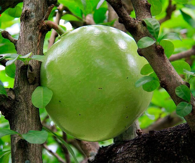 Quả đào tiên còn có tên gọi khác là quả trường sinh, có nguồn gốc từ Brazil và thuộc họ núc nác. Loại cây này có thể cao từ 7 đến 10 mét, đặc điểm nổi bật là lá mọc thành tán, xanh tươi quanh năm, tạo nên một khung cảnh xanh mát, dễ chịu.