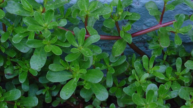 Thân mọng nước, trơn nhẵn, có màu hơi đỏ hoặc tím đỏ và bò sát mặt đất cùng với các lá xanh mọc xen kẽ hoặc mọc đối với nhau. Phần rễ gồm có rễ cái và nhiều rễ thứ dạng sợi, có khả năng chịu hạn rất tốt, thậm chí là đất nghèo dinh dưỡng.