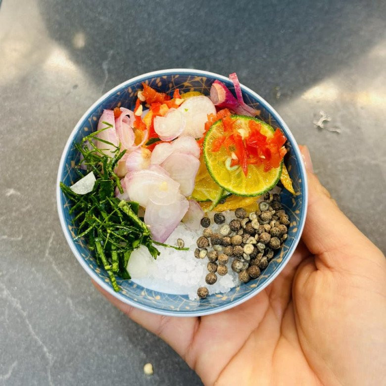 - Các gia vị bao gồm muối trắng + tiêu + quất thái lát + lá chanh thái sợi + hành tím thái lát + ớt thái lát cho tất cả vào bát. Vắt chanh hoặc quất khi ăn.