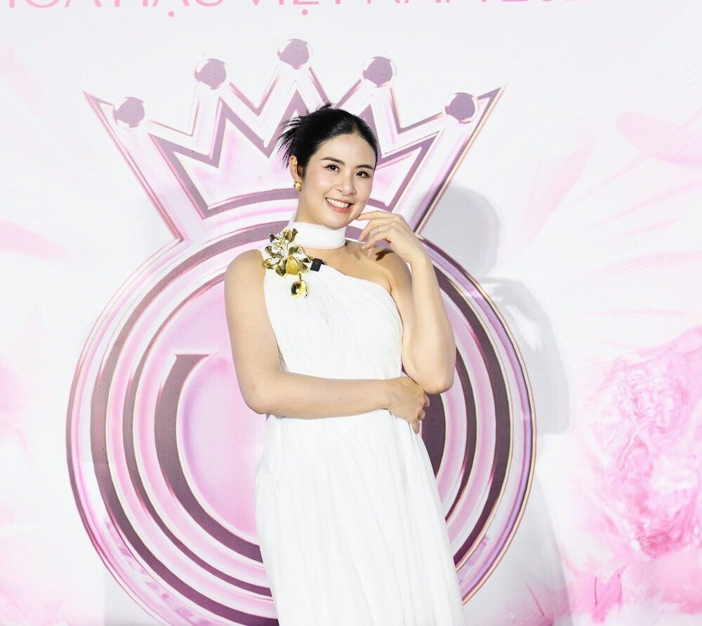 Hoa hậu Ngọc Hân xuất hiện nền nã với chiếc đầm dạ hội trắng tinh khôi.