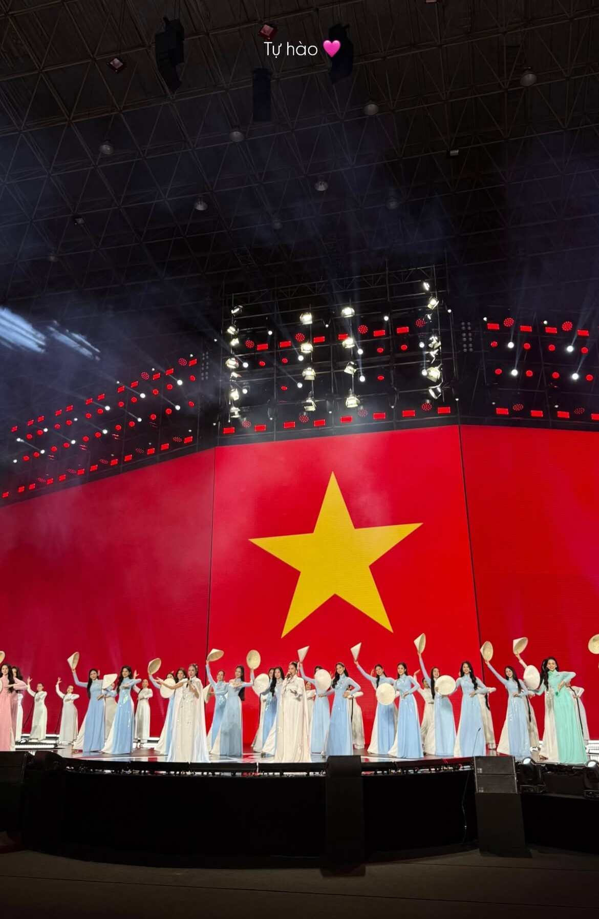 Khoảnh khắc đầy tự hào khi các cô gái xuất hiện với chiếc áo dài cùng màn hình là lá cờ Việt Nam.