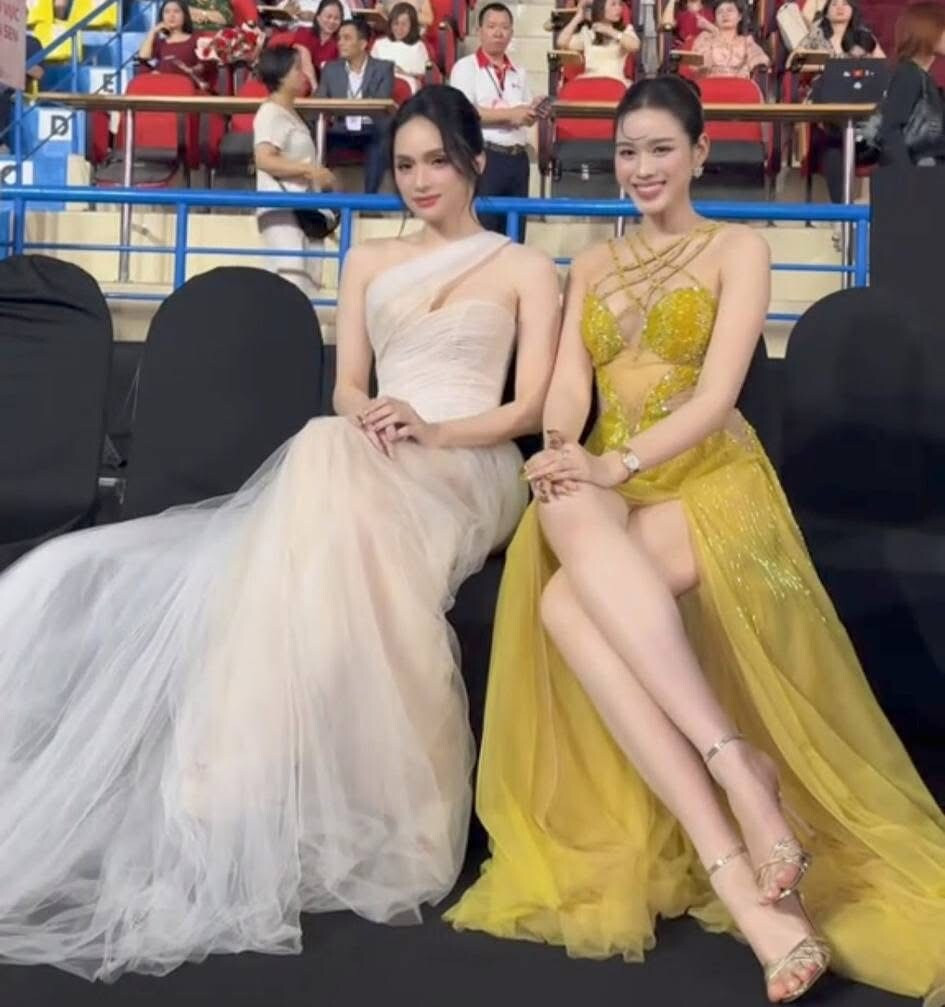 Đỗ Thị Hà và Á hậu Trịnh Thuỳ Linh ngồi hàng đầu theo dõi và động viên các thí sinh trong đêm thi quan trọng Trong khi đó Á hậu Ngọc Hằng trở thành MC dẫn dắt chương trình.