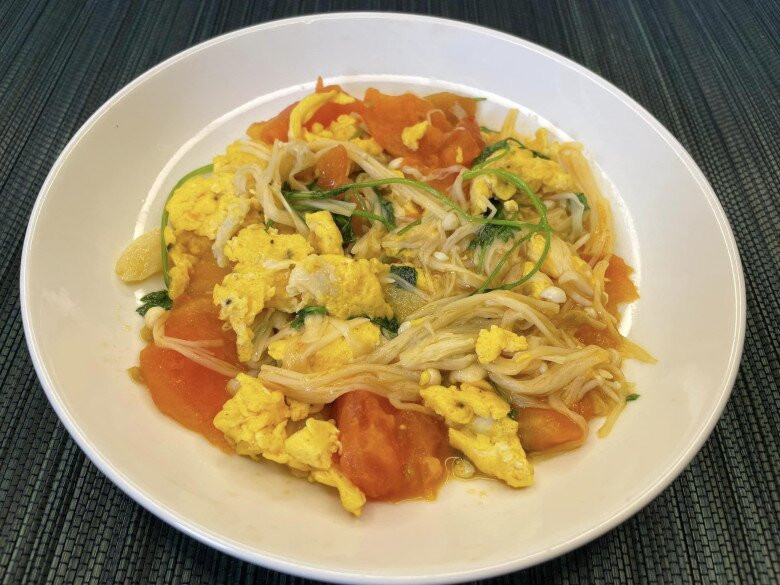 9. TRỨNG XÀO NẤM KIM CHÂM, CÀ CHUA