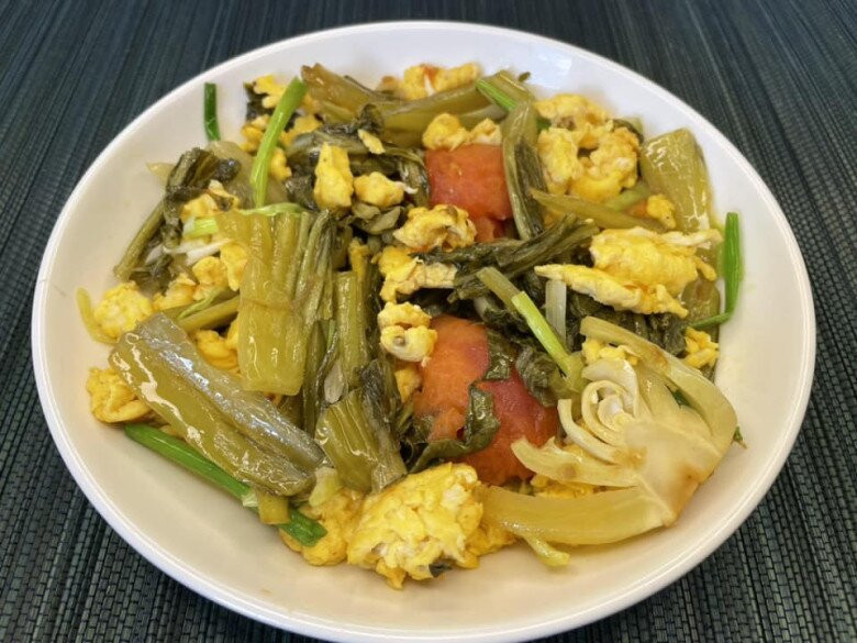 Cho dầu ăn vào chảo, đổ dưa chua vào xào săn. Sau đó cho vài lát cà chua vào. Đổ trứng vào, đảo đều cho trứng bám đều vào dưa. Thêm chút gia vị nếu cần, rắc hành lá, trứng chín tới thì tắt bếp.
