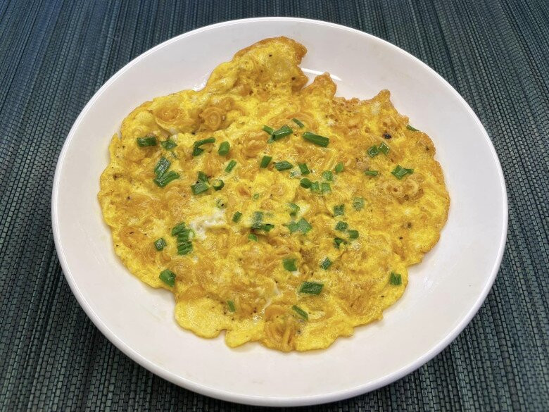 Đun nóng dầu ăn trong chảo, đổ trứng mì tôm vào, chiên chín.