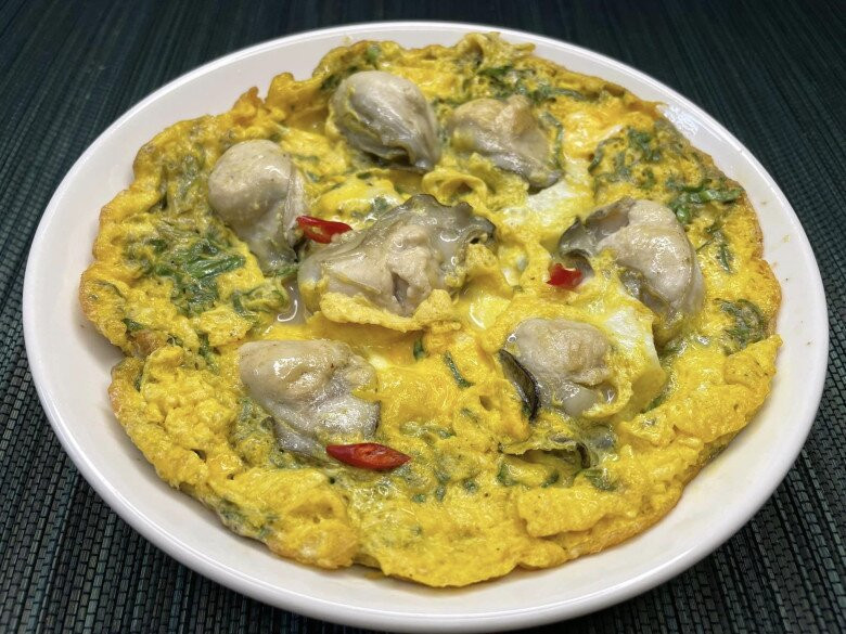 - Dàn đều hàu trong chảo rồi đổ trứng vào rán cùng cho đến khi chín.