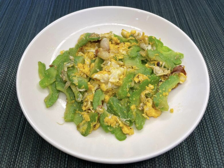 Chuẩn bị: Cho một ít dầu vào chảo, cho mướp đắng thái lát vào, đảo nhanh tay trên lửa lớn khoảng 1 phút, nêm bột canh vừa ăn. Đổ trứng đã đập ra bát vào, đảo nhanh tay trong 30 giây đến 1 phút thì tắt bếp.
