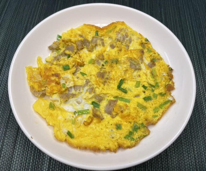 Đập 2 quả trứng ra bát, thêm 50g thịt băm vào cùng hành lá, muối vừa ăn. Khuấy đều. Phi thơm hành khô, đổ trứng thịt vào, dàn đều khắp chảo, chiên cho đến khi chín 2 mặt.