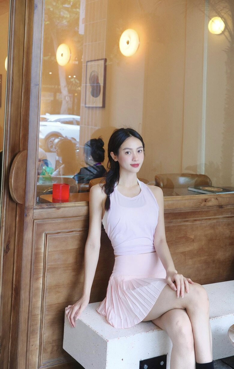 Khác xa với những bộ trang phục dạ hội rực rỡ, khi dạo cà phê cùng bạn bè, nàng Á hậu chỉ diện đơn giản áo thun và váy ngắn mà vẫn xinh đẹp ngọt ngào
