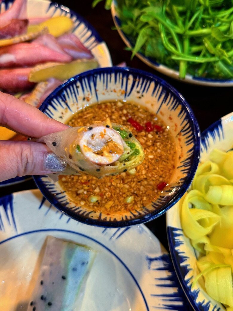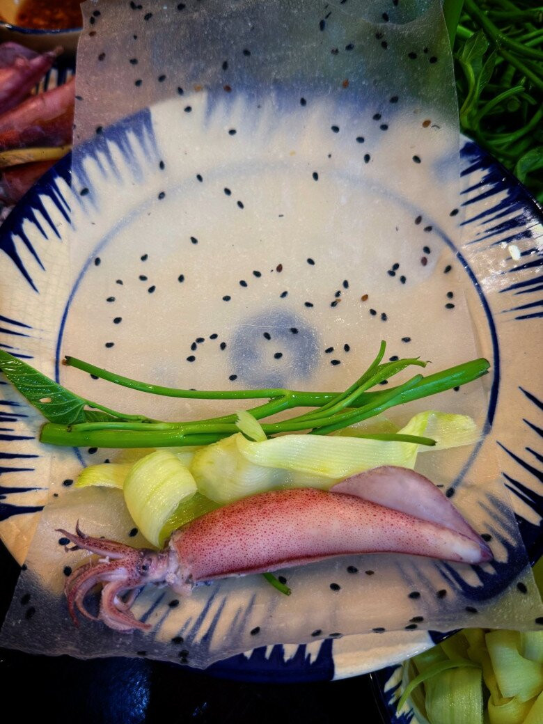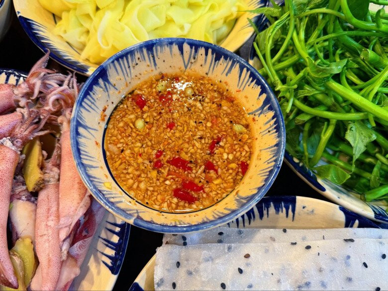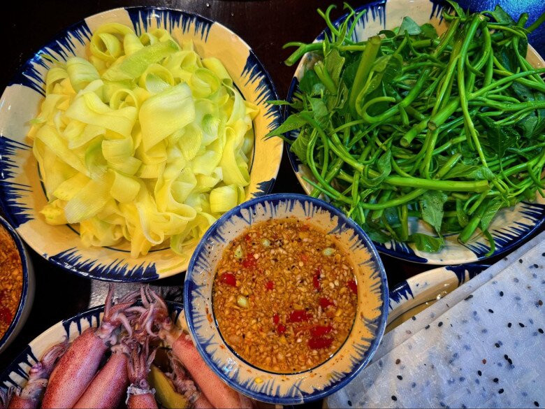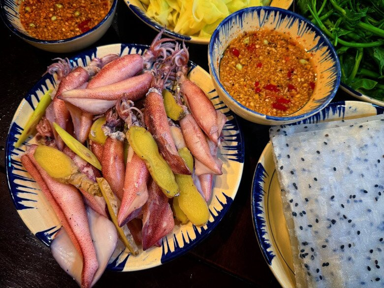 Dạo gần đây, món mực hấp cuốn rau muống bánh tráng bỗng dưng “làm mưa làm gió” trên các trang mạng xã hội và nhanh chóng trở thành món ăn yêu thích của nhiều người. Sự kết hợp giữa mực tươi hấp giòn ngọt, rau muống sống giòn mát và bánh tráng mè đen dẻo dai tạo nên hương vị mới lạ, hấp dẫn. Điểm nhấn đặc biệt của món này là nước chấm mắm gừng chua ngọt đậm đà, vừa kích thích vị giác vừa làm tăng độ ngon của món ăn.