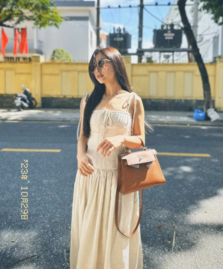Nhật Lê toát lên khí chất sang chảnh, giàu có với thiết kế váy maxi 2 dây. Trên tay cô là chiếc túi xách size 25 cũng của Hermes. Phiên bản Hermes Kelly này được cô nàng yêu thích được 1 vài năm gần đây.
