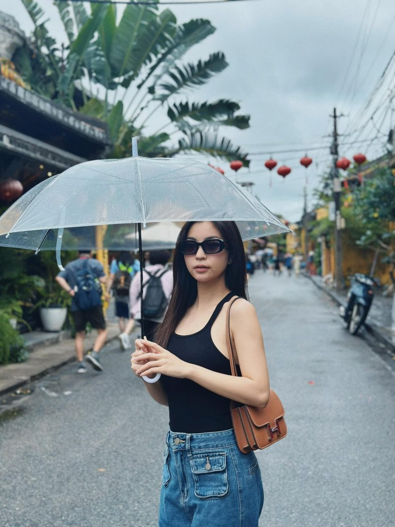 Cô nàng đăng tải kèm dòng chú thích: "Gặp mưa thì che ô. Vậy giờ gặp ai để được che chở?" với set đồ cá tính trên phố phường Hội An.