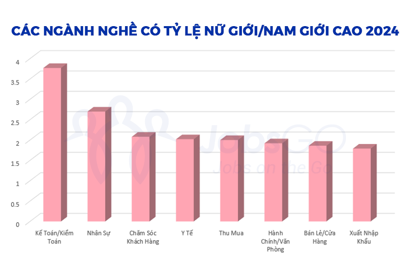 Trong nghiên cứu của JobsGO, ngành có tỷ lệ Nữ giới so với Nam giới cao nhất là ngành Kế toán/Kiểm toán với tỷ lệ 3.77 (số lượng Nữ giới gấp gần 4 lần Nam). Đây là ngành đòi hỏi sự tỉ mỉ, cẩn thận và thường là việc văn phòng không phải đi lại nhiều, phù hợp với tính cách của các chị em.