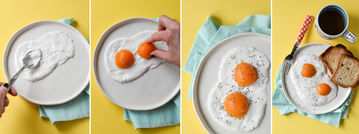 Bữa ăn sáng kiểu Anh “fake” thì cần thêm chút đầu tư bởi bạn phải làm "trứng ốp la" từ sữa chua, mơ hoặc đào ngâm và hạt chia rắc lên trên. Cú lừa này cũng ngoạn mục đấy chứ? (Nguồn ảnh: Fork and Beans)