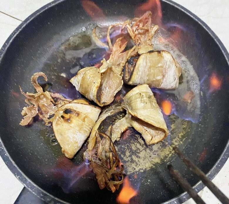 Hết thời gian ngâm, cho mực vào trong chảo/nồi, rưới lượng cồn vừa phải lên rồi mới châm lửa. Khi cồn cháy, dùng đũa dài hoặc kẹp dài để lật mực liên tục, giúp mực chín đều và không bị cháy.