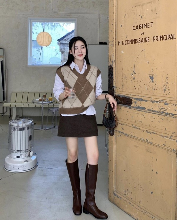 Ngoài ra nếu muốn tăng hiệu quả "hack" chiều cao thì nàng phối chân váy suông cùng boots cao cổ cũng đẹp.