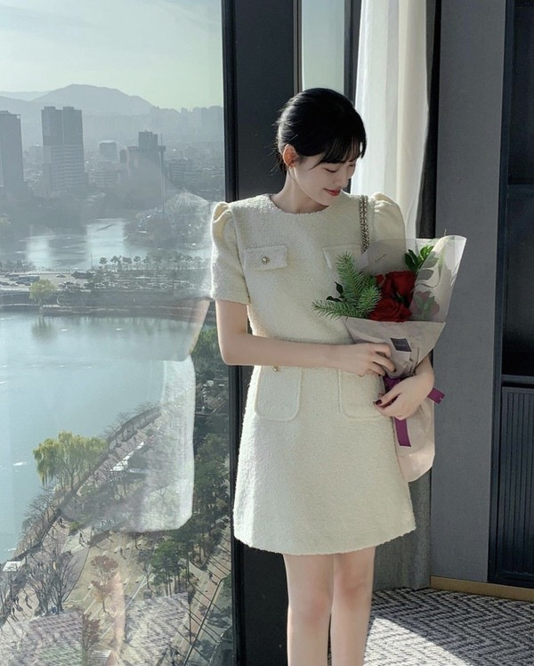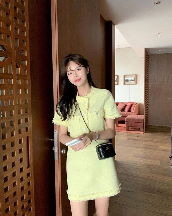 Thiết kế suông nhẹ nhàng, độ dài vừa đủ của váy vải tweed rất phù hợp với các nàng nấm lùn.