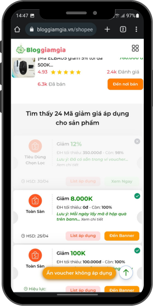 Lúc bấm tìm mã hệ thống tìm thấy bao nhiêu mã áp dụng được với sản phẩm của bạn nó sẽ thông báo luôn. Như sản phẩm trên là có tới 24 mã áp dụng được nhé. Mã nào sáng lên là dùng được, mã nào tối là không dùng được. Bạn có thể bấm vào nút Ẩn voucher không áp dụng để ẩn đi toàn bộ các mã không áp dụng được cho sản phẩm.