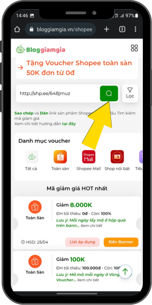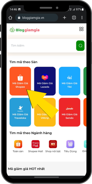Khi đã tiến hành thực hiện xong 3 bước ở trên bạn cần truy cập ngay trang web Bloggiamgia.vn. Tại giao diện chính của trang hãy tìm và bấm ngay vào biểu tượng Mã giảm giá Shopee.