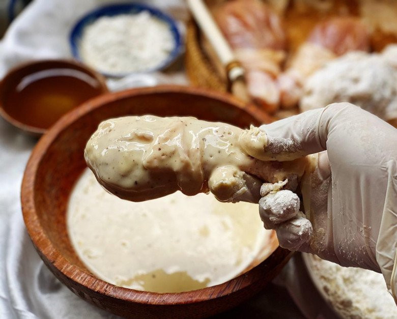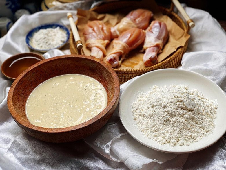 - Khi dầu nóng, lăn đùi gà lần lượt qua bát bột ướt rồi sang bát bột khô, sau đó thả vào chảo dầu.