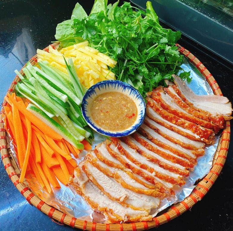 Cho các loại rau sống đã rửa sạch, dưa chuột và cà rốt cùng dứa thái que lên mẹt. Xếp thịt heo quay ra rồi cuốn tất cả với bánh tráng và thưởng thức.