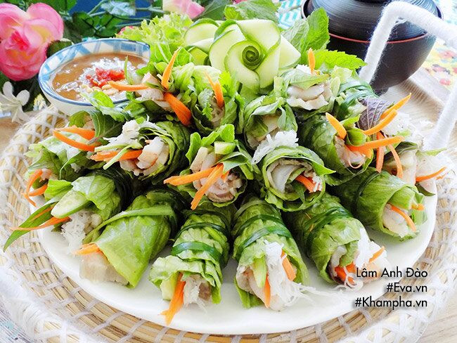 Trải lá xà lách ra dĩa, xếp thịt, rau thơm, dưa leo, chút bún và cà rốt. Nhẹ nhàng cuộn tròn. Dùng cọng hẹ cột chính giữa là hoàn tất.