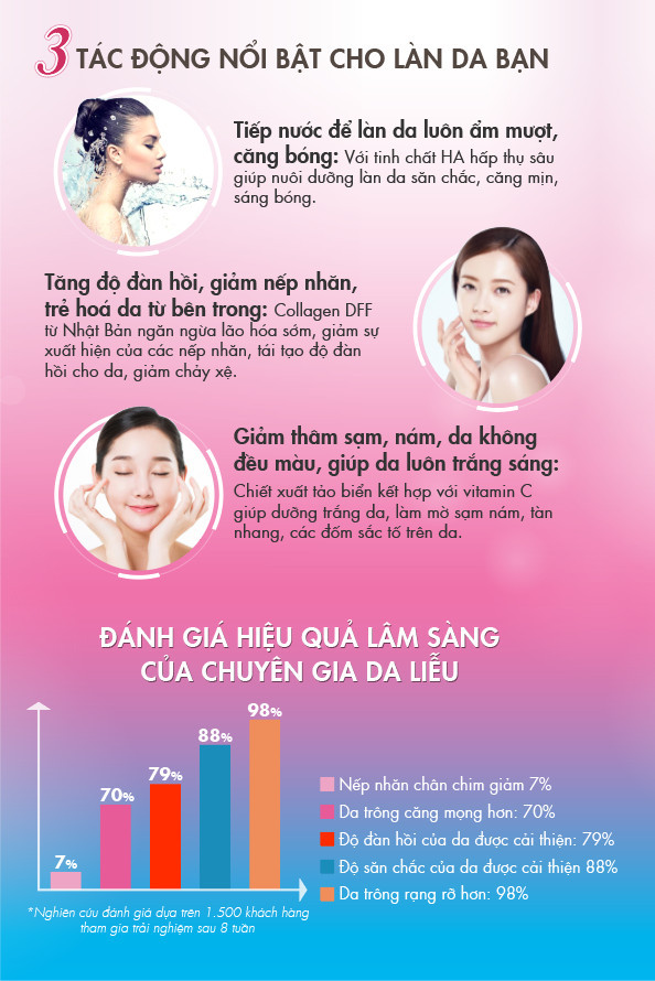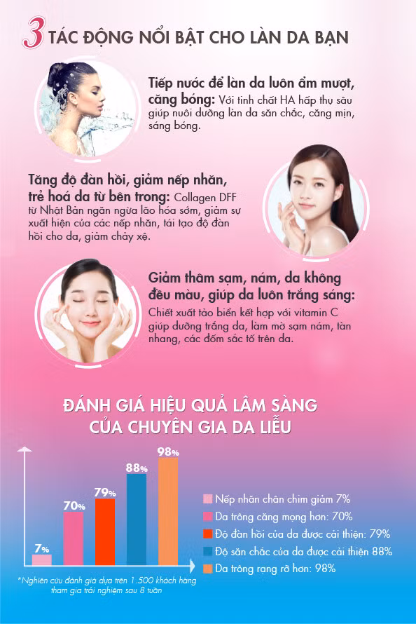 Với 5 thành phần nhập khẩu đắt giá trong công thức bao gồm: Collagen DFF Nhật Bản, chiết xuất tảo biển Nhật Bản, vitamin C Hàn Quốc, chiết xuất sữa ong chúa Nhật Bản, Tranexamic acid. Đây đều là những hoạt chất có công dụng được giới chuyên môn kiểm chứng qua nhiều nghiên cứu lâm sàng.