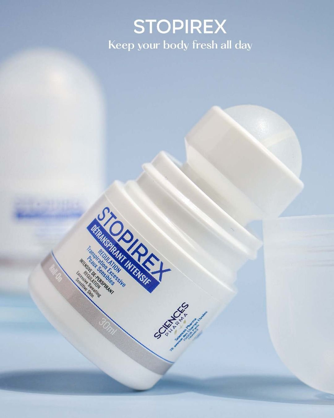 Ra đời bởi Sciences Pharma, lăn khử mùi Stopirex được chứng nhận bởi các tổ chức y tế hàng đầu. Sản phẩm nổi bật với công thức kết hợp các thành phần công thức muối nhôm thế hệ mới aluminum sesquichlorohydrate, tinh chất hoa cúc và dầu tràm trà. Đây đề là những thành phần vô cùng lành tính và hiệu quả trong việc khử mùi cơ thể, giúp làn da luôn khô thoáng.